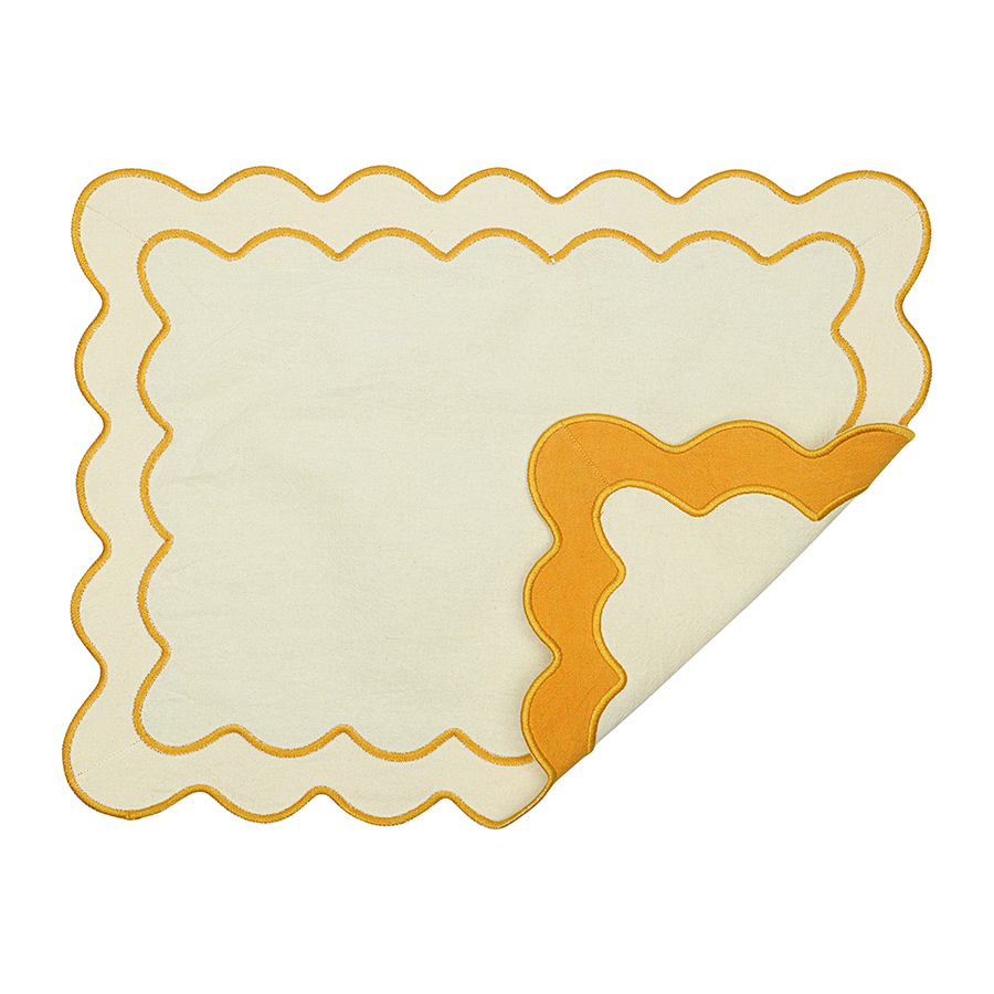 Салфетка под приборы с контрастным кантом горчичного цвета из коллекции Trendy Ruffles сделает любую сервировку стильной, позволив экспериментировать с текстурами и формами. Текстиль с волнистой отделкой, напоминающей изящные раковины морских гребешков, стал ярким элементом стиля Ар Деко – и сейчас возвращается в моду, появляясь в самых актуальных интерьерных решениях.